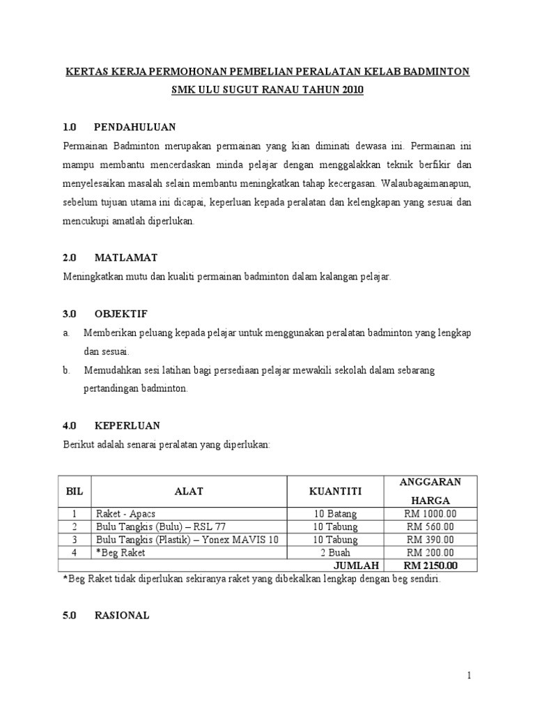 Kertas kerja ini bertujuan untuk mendapatkan peruntukan dari Persatuan Belia 4B M Daerah Jerantut dan Yang Berhormat Ahli Parlimen Jerantut Ahmad Nazlan Bin Idris serta pihak Belia Daerah Jerantut agar mempertimbangkan peruntukan yang diusulkan dan seterusnya menganjurkan Kejohanan Tertutup Futsal Piala Belia 4B M Daerah. 09042012 contoh kertas kerja penganjuran kejohanan badminton sekolah kebangsaan panchor merah. Pertandingan kejohanan badminton tertutup skpm 2008.